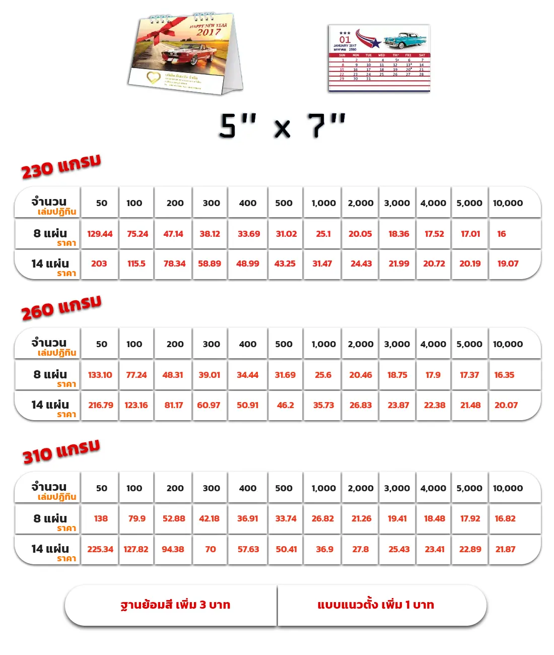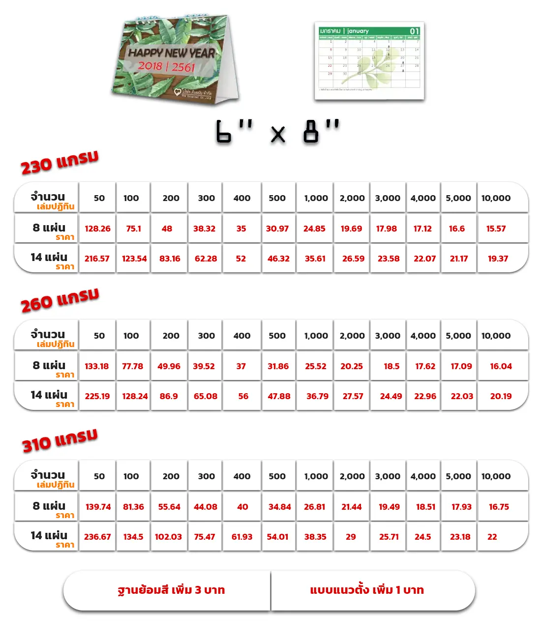 เนื้อปฏิทินกระดาษอาร์ตการ์ด พิมพ์ออฟเซ็ท 4 สี 2 ด้าน ขนาดสั้นกว่าขาตั้ง 1-1.5 นิ้ว